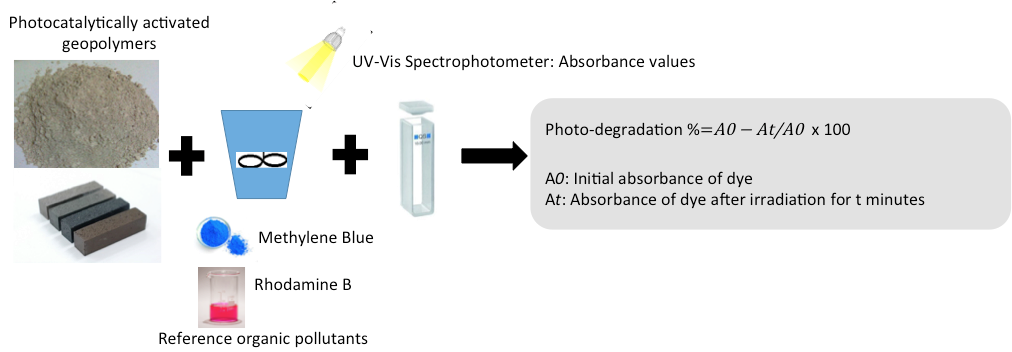 Geopolymers are amorphous structured sodium-aluminosilicate materials that are known to exhibit high mechanical performance. They are seen as future alternatives of Portland cement due to their environmentally friendly synthesis conditions and low energy consumption during production. Recent research efforts have demonstrated that these materials can be designed to exhibit photocatalytic activity, i.e. self cleaning ability. This research aims to the develop geopolymeric materials that display photocatalytic activity to degrade organic pollutants. In this context, geopolymers are synthesized based on different solid raw materials (precursors) and are post-treated to enhance photocatalytic activity. Photocatalytic activity and microstructural features in these materials are being investigated by employing UV-vis spectroscopy, FTIR spectroscopy, scanning electron microscopy (SEM) and energy dispersive X-ray (EDS) analyses to understand structure-activity relationships in the system.